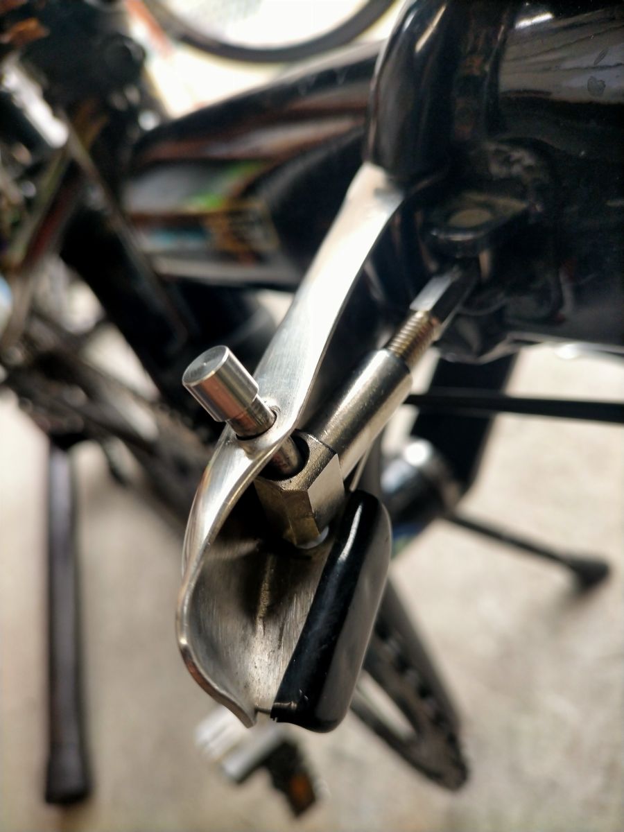 この前バイトに乗っていった時に違和感があって あっ自転車の話しね。 フロントブレーキをかけるとフレームのつなぎ目が動く。 その時はそのまま帰宅して次の日見てみると つなぎ目のところがひん曲がっている^^;;; 確かヒンジ部はもう一つ予備で取寄せしていたのですが これくらいで勿体無いので しっかりとしたネジで修理した。